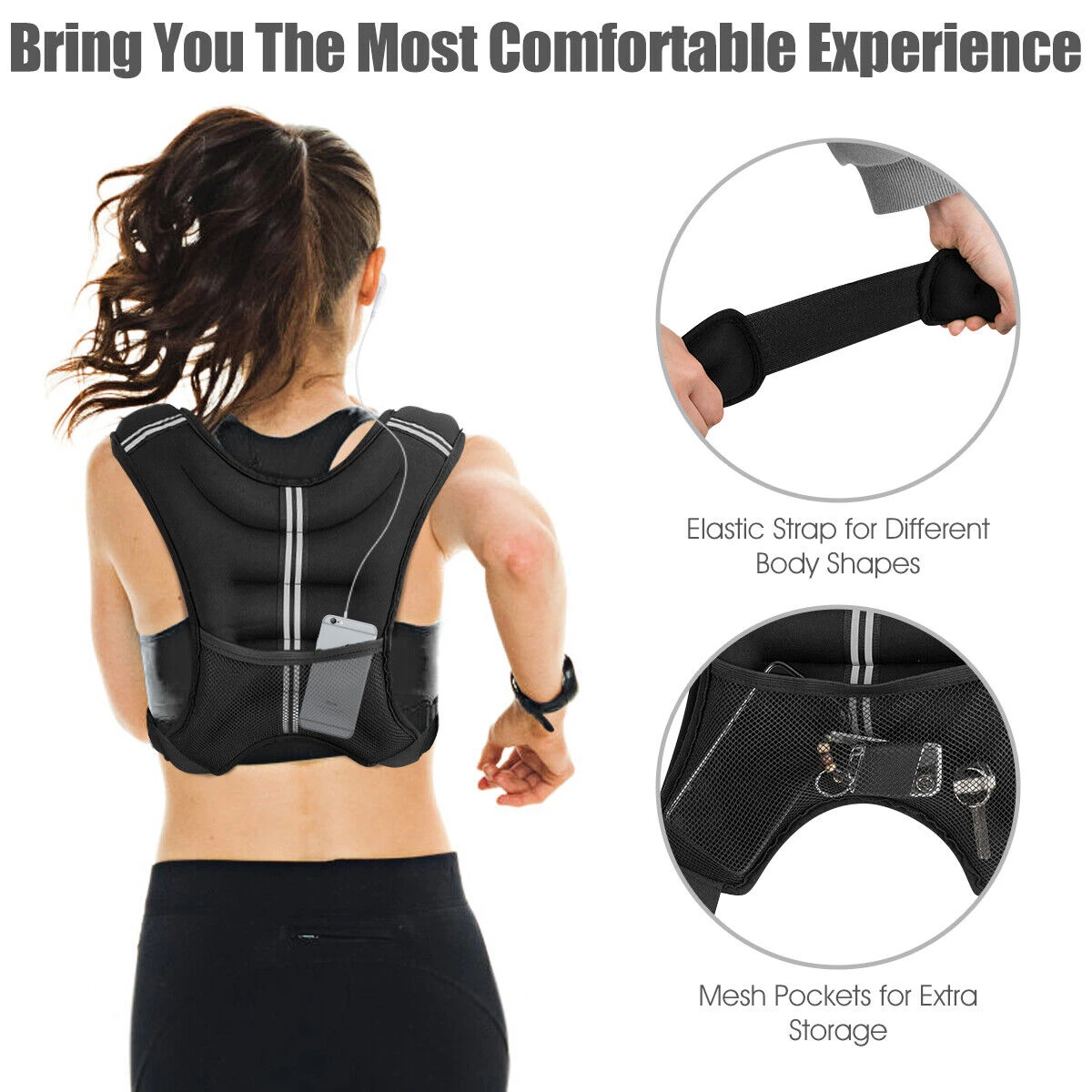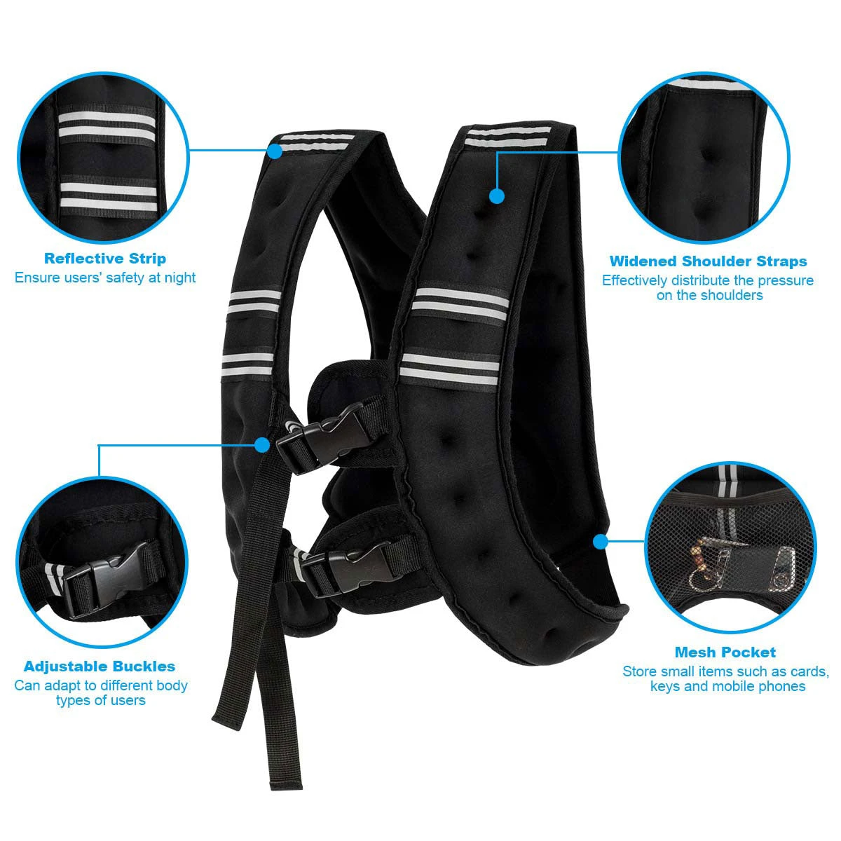 Our weighted vest is a good workout equipment for both man and woman. You can wear it when you climb mountain, run or do sports. The weighted vest can help you lose weight, burn more calories, increase your power and build muscle. Besides, this weighted vest is made from 2.5mm Neoprene, filled with black iron sand. So you can feel comfortable when you exercise. In addition, it has reflective strip to ensure you safety in your night workout. What’s more, there is an extra storage pocket in the back of the weighted vest, and you can store some small items in it. And the thickened and widened shoulder straps can evenly distribute the pressure on the shoulders. Have it, you will have the perfect body and strong physique.